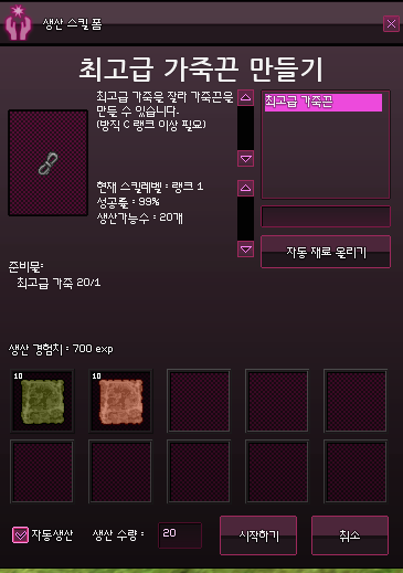 그랜드 마스터 재단사를 이용하였을때 가죽끈을 만들면 확률에 따라 재료가 회수되는데 이 확률이 얼마고