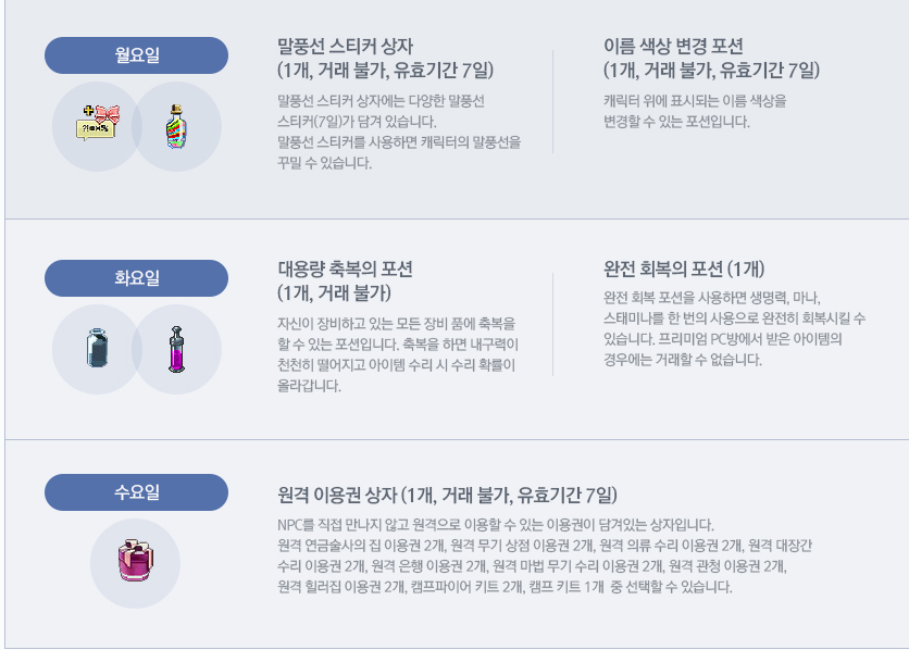 사용하시면 캐릭터당 1개씩 아이템을 요일별로 은행에서 받으실 수 있습니다.