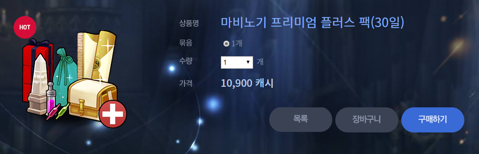 캐시로 10900원에 살수있는 마비노기 프리미엄 플러스 팩(프플팩)을